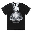 This tee features a logo printed on the left chest of the front, and a large graphic with an iconic face on the back of the neck. The distinctive design expresses the title "REBIRTH IN RABBIT". The black and white monotone color scheme is eye-catching.